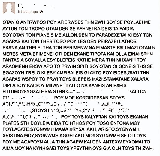 Στην ανάρτησή του ο άτυχος άντρας γράφει: «Οταν ο άνθρωπος που του αφιέρωσες τη ζωή σου σε πουλάει με αυτόν τον τρόπο. Οταν δεν σε αφήνει να δεις τα παιδιά σου, όταν τον πιάνεις με άλλον, δεν το παραδέχεται κι εσύ τον αγαπάς και τον θες τόσο που λες, δεν πειράζει λάθος έκανα, αν θέλει θα τον περιμένω να είμαστε πάλι μαζί. Οταν πέντε μέρες μετά επιμένει ότι δεν έκανε τίποτα και όλα είναι στη φαντασία σου, αλλά εσύ βλέπεις κάθε μέρα τη μηχανή του αραγμένη έξω από το σπίτι σου. Οταν οι γονείς της σε βγάζουν τρελό κι εσύ αμφιβάλλεις γι’ αυτό που είδες, γιατί την αγαπάς. Ωσπου το πρωί τους βλέπεις μαζί, σταματάνε χαλαρά δίπλα σου και σου μιλάνε. Τι άλλο να κάνεις, αν έχεις φιλότιμο; Συγχαρητήρια στην (…) και τον (…) που με κορόιδεψαν, στους (…) που τους κάλυπταν και τους έκαναν πλάτες στη δουλειά. Είδα το ήθος που τόσο έντονα μου πουλάγατε. Συγγνώμη, μαμά, Χρύσα, Ακη, Αρίστο. Συγνώμη, Χριστίνα μου, συγγνώμη Αγγελάκο μου. Συγγνώμη σε όλους που με αγαπούν, αλλά την αγαπώ και δεν αντέχω. Εύχομαι το αίμα μου να κυνηγάει τους υπευθύνους για όλη τους τη ζωή».