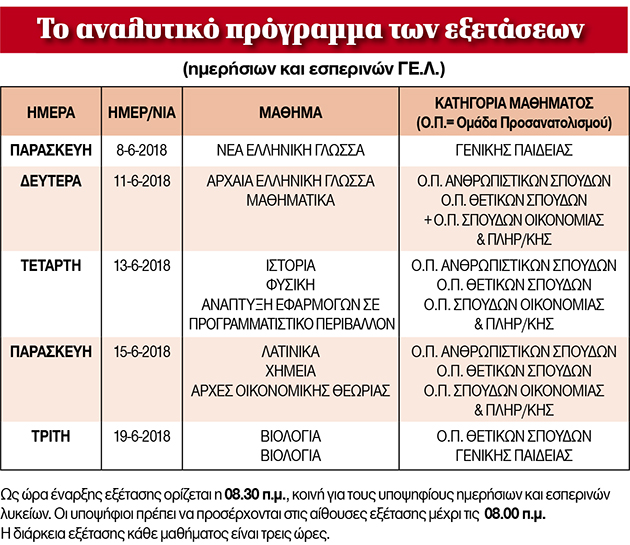 ❱❱ Πρεμιέρα στις 8 Ιουνίου θα κάνουν οι πανελλαδικές εξετάσεις για τα ημερήσια και εσπερινά Γενικά Λύκεια, ενώ στις 7 Ιουνίου θα αρχίσουν οι εξετάσεις στα ΕΠΑ.Λ., όπως ανακοίνωσε το υπουργείο Παιδείας. Οι φετινοί υποψήφιοι θα έχουν -θεωρητικά- «ευκολότερο» έργο έως ότου φθάσουν στις πανελλαδικές, καθώς οι απολυτήριες εξετάσεις της Γ’ τάξης του ημερήσιου και της Δ’ τάξης του Εσπερινού Λυκείου θα γίνουν μόνο σε τέσσερα μαθήματα: στη Νεοελληνική Γλώσσα και Λογοτεχνία μαζί, στην Ιστορία, στα Μαθηματικά και στη Βιολογία.