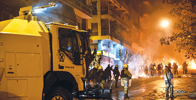 Πέτρες και βόμβες μολότοφ έπεφταν βροχή κατά των αστυνομικών, οι οποίοι απαντούσαν με δακρυγόνα. Η ατμόσφαιρα στους γύρω δρόμους των Εξαρχείων ήταν αποπνικτική και παντού υπήρχαν εστίες φωτιάς. Ακόμα και τις στιγμές όπου οι αναρχικοί σταματούσαν τις επιθέσεις το κλίμα ήταν εκρηκτικό. Αργά το βράδυ ο κλεφτοπόλεμος είχε περιοριστεί στους δρόμους γύρω από το Πολυτεχνείο, με τους κουκουλοφόρους να προβαίνουν σε καταδρομικές επιθέσεις από τις οδούς Τρικούπη, Σούτσου και Τσαμαδού. Νωρίτερα είχαν στήσει οδοφράγματα ύψους δύο μέτρων στην οδό Τοσίτσα, προκειμένου να εμποδίσουν τη διέλευση των υδροφόρων οχημάτων που είχαν επιστρατευτεί με επιτυχία στην επέτειο του Πολυτεχνείου.
