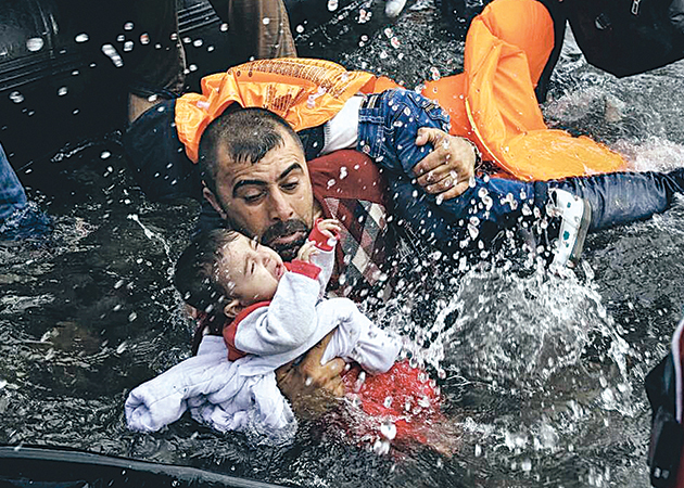 Σύρος πρόσφυγας κρατά τα παιδιά του και προσπαθεί να βγει από βάρκα το 2015 στη Λέσβο