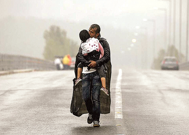 Πρόσφυγας με την κορούλα του αγκαλιά περπατά προς τα σύνορα το 2015 στην Ειδομένη