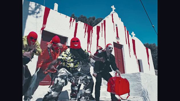 Στα τρία λεπτά και 24 δευτερόλεπτα που διαρκεί το βίντεο εμφανίζονται μαυροντυμένα άτομα με μάσκες στο πρόσωπο και κόκκινα μάτια στην οροφή μιας βίλας της Μυκόνου, ενώ σμήνη από μαύρα κοράκια πετούν στον ουρανό.