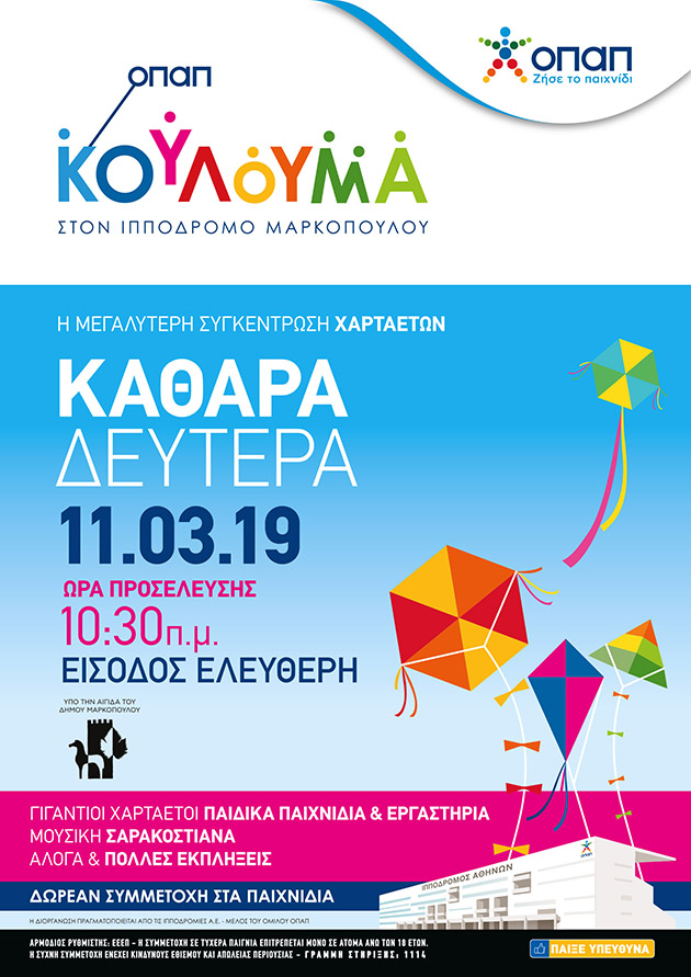 Όπως και πέρυσι έτσι κι εφέτος την Καθαρά Δευτέρα, ο ΟΠΑΠ διοργανώνει, υπό την αιγίδα του Δήμου Μαρκοπούλου, μια μεγάλη γιορτή με χαρταετούς για τα παιδιά στο χώρο του Ιπποδρόμου.Σε όλη τη διάρκεια της ημέρας, μικροί και μεγάλοι θα απολαμβάνουν ένα show με πολύχρωμους γιγάντιους χαρταετούς.