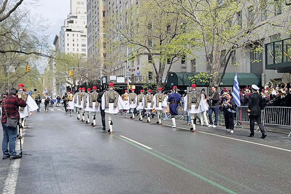 Αγημα των Ευζώνων της Προεδρικής Φρουράς απέσπασε για μια ακόμη φορά το θερμό χειροκρότημα στην πλέον συγκινητική και δυνατή στιγμή της παρέλασης στην 5η Λεωφόρο, φτάνοντας ως την εξέδρα των επισήμων, στην 68η Οδό, όπου έγιναν η ανάκρουση και η ερμηνεία του αμερικανικού και του ελληνικού εθνικού ύμνου.