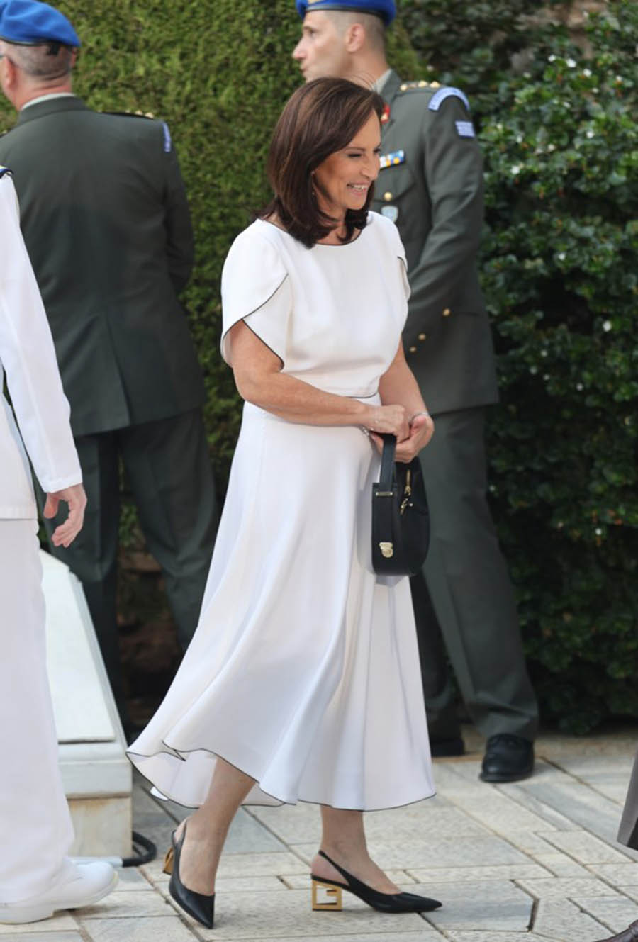 Την παράσταση όμως δεν έκλεψε το μενού ή το επιδόρπιο, αλλά η συνήθης πασαρέλα των κυριών, που «μετρήθηκαν σε κομψότητα», αλλά και σε κακό γούστο ορισμένες, φορώντας κοκτέιλ φορέματα, ταγιέρ, κοστούμια, πέδιλα, φλατ σανδάλια και total white φορέματα. Ολα μπλέχτηκαν γλυκά στους κήπους του φωτισμένου Προεδρικού Μεγάρου, που «έβαλε τα καλά του» για την επέτειο των 50 ετών από την Αποκατάσταση της Δημοκρατίας στη χώρα.