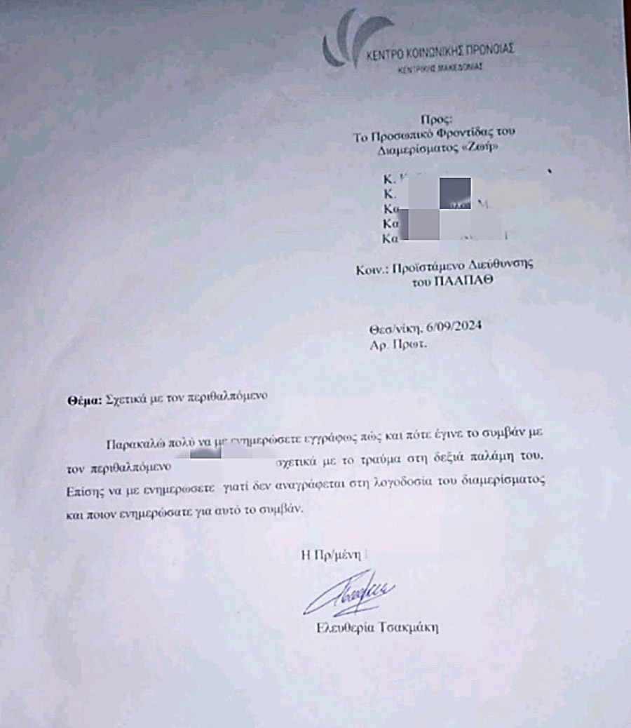 Οι υπεύθυνοι στο διαμέρισμα όπου μένει ο τρόφιμος όχι μόνο δεν έκαναν καλά τη δουλειά τους, αλλά προσπάθησαν και να αποκρύψουν το περιστατικό, όπως προκύπτει από έγγραφο της προϊσταμένης Περίθαλψης Ελευθερίας Τσακμάκη στις 6-9-2024 προς τους πέντε φροντιστές του διαμερίσματος «Ζωή», που κοινοποιείται και στον προϊστάμενο της Διεύθυνσης του Παραρτήματος Αποθεραπείας και Αποκατάστασης Παιδιών με Αναπηρία Θεσσαλονίκης «Ο Αγιος Δημήτριος» (ΠΑΑΠΑΘ). «Παρακαλώ πολύ να με ενημερώσετε εγγράφως πώς και πότε έγινε το συμβάν με τον περιθαλπόμενο Μ.Β., σχετικά με το τραύμα στη δεξιά παλάμη του. Επίσης, να με ενημερώσετε γιατί δεν αναγράφεται στη λογοδοσία του διαμερίσματος και ποιον ενημερώσατε γι’ αυτό το συμβάν» αναφέρει το υπηρεσιακό έγγραφο.