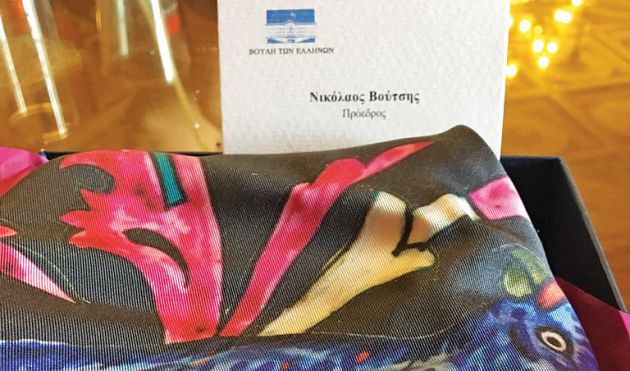 Ο πρόεδρος της Βουλής όμως δεν εκτελεί μόνο τα κοινοβουλευτικά καθήκοντά του, αλλά φροντίζει και για τις κυρίες του Κοινοβουλίου. Ετσι λοιπόν την Ημέρα του εορτασμού της Γυναίκας χάρισε στις βουλευτίνες από ένα ωραίο μεταξωτό μαντίλι (φωτό κάτω). Σπουδαία και «ιπποτική» η χειρονομία του προέδρου.