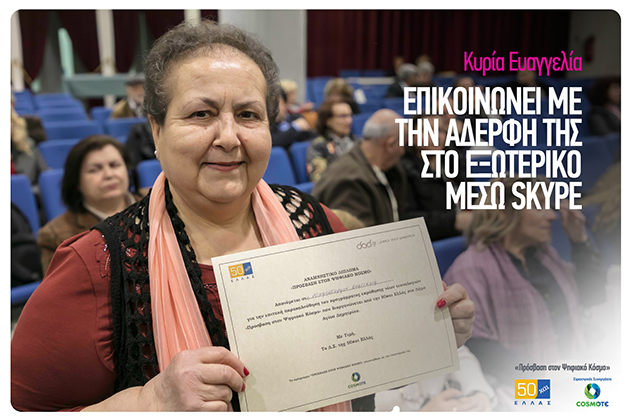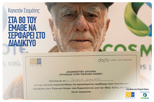 Σε δύο νέα εκπαιδευτικά κέντρα στην Αττική, στον Δήμο Πειραιά και τον Δήμο Αμαρουσίου, επεκτείνεται το πρόγραμμα «Πρόσβαση στον Ψηφιακό Κόσμο» που στηρίζει η COSMOTE και υλοποιεί ο φορέας «50 και Ελλάς». Το πρόγραμμα έχει στόχο να διευκολύνει την καθημερινότητα των ανθρώπων μεγαλύτερης ηλικίας και να τους φέρει πιο κοντά στους αγαπημένους τους, με τη βοήθεια των ψηφιακών μέσων. Οι συμμετέχοντες μαθαίνουν πώς να αξιοποιούν τις τεχνολογίες αφής (Tablets), να πλοηγούνται στο Internet, να χρησιμοποιούν τα Social Media και τις εφαρμογές (π.χ. χάρτες, ημερολόγιο). Έτσι, μπορούν να ενημερώνονται καλύτερα, να επικοινωνούν με τον κόσμο και να οργανώνουν τις καθημερινές τους δραστηριότητες.