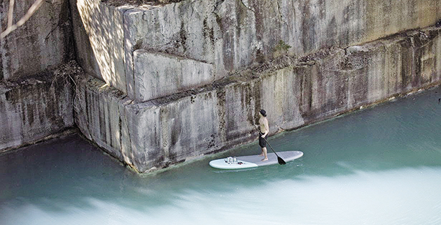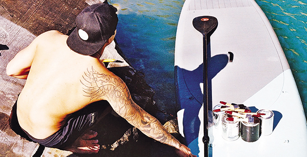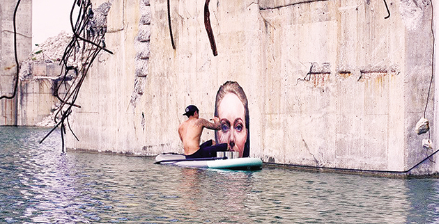 Είναι γνωστός street artist, ωστόσο τα πιο εντυπωσιακά έργα του «αναδύονται» από το νερό. Ο γεννημένος στη Χαβάη ζωγράφος Σιν Γιόρο, γνωστός και ως Hula, είναι ο άνθρωπος που κρατώντας ισορροπία πάνω σε μια σανίδα του σερφ, στην οποία ίσα ίσα που χωράει, αφού τη μοιράζεται με τα χρώματά του, σχηματίζει σε τοίχους κτιρίων που έχουν μισοβυθιστεί και εγκαταλειφθεί εντυπωσιακές γυναικείες μορφές, που τόσο πολύ μοιάζουν με την Αντζελίνα Τζολί.