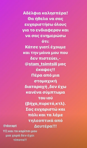 «Αδέλφια, καλησπέρα! Θα ήθελα να σας ευχαριστήσω όλους για το ενδιαφέρον και να σας ενημερώσω ότι: Κάτσε, γιατί έχουμε και τη μάνα μου που δεν πιστεύει – Σταματίνα Τσιμτσιλή μάς έκαψες! Πέρα από μια στομαχική διαταραχή, δεν έχω κανένα σύμπτωμα του ιού (βήχα, πυρετό κ.λπ.). Σας ευχαριστώ και πάλι, και τα λέμε τηλεοπτικά από Δευτέρα!» έγραψε χαρακτηριστικά, συμπληρώνοντας πως είναι μια χαρά και η σύντροφός του Δώρα.