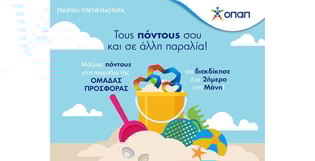 Δύο καλοκαιρινά δώρα περιμένουν τα μέλη της «Ομάδας Προσφοράς» ως επιβράβευση για τη συμμετοχή του στις πρωτοβουλίες Εταιρικής Υπευθυνότητας του ΟΠΑΠ, που χάρισαν παιδικά χαμόγελα.Οι υποστηρικτές των δράσεων του ΟΠΑΠ μπορούν τώρα να διεκδικήσουν δύο ταξίδια στη Μάνη, αρκεί να κατεβάσουν δωρεάν την εφαρμογή «Ομάδα Προσφοράς» και να συμμετάσχουν στις δοκιμασίες. Όσο παίζουν, συγκεντρώνουν πόντους που τους φέρνουν πιο κοντά στο έπαθλο, το οποίο περιλαμβάνει ένα διήμερο στο Kyrimai Hotel και ένα cooking class με τον chef του ξενοδοχείου. Νικητές θα αναδειχθούν τα δύο μέλη της «Ομάδας Προσφοράς ΟΠΑΠ» που θα συγκεντρώσουν τους περισσότερους πόντους έως τις 9 Σεπτεμβρίου.