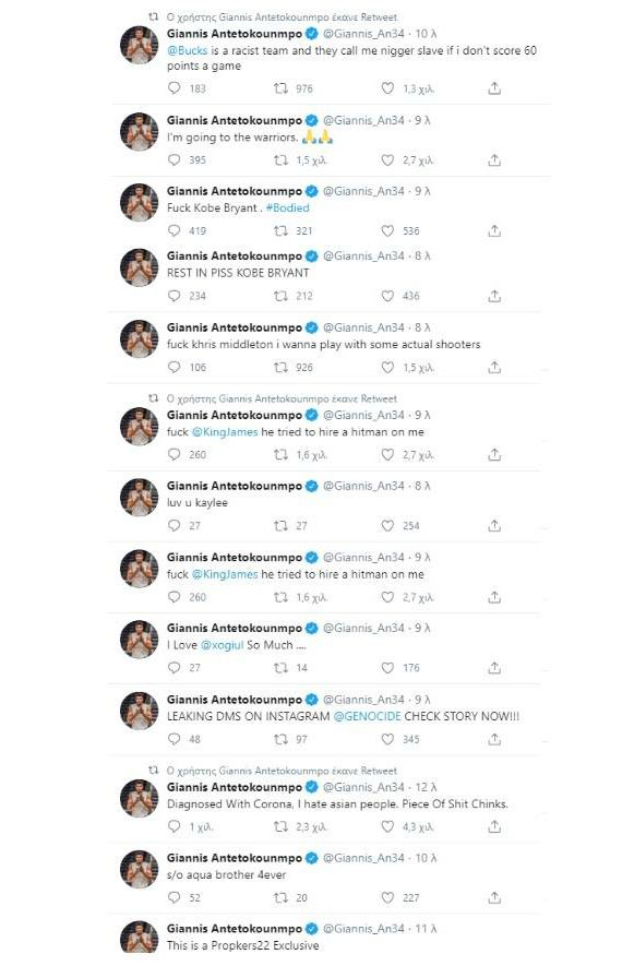 Μη μπορώντας να συγκρατηθεί ο Γιάννης Αντετοκούμπο, ξέσπασε, ζητώντας συγνώμη από τους Μπακς, τον Λεμπρόν Τζέιμς και την οικογένεια του Στεφ Κάρι καθώς και από την οικογένεια του αδικοχαμένου Κόμπι Μπράιαν, για τα αισχρά σχόλια που γράφτηκαν εις βάρος τους μέσω του λογαριασμού του.