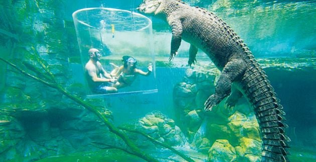 Πρόκειται για ατραξιόν στον Μεγάλο Κοραλλιογενή Υφαλο, στο Ντάργουιν της Αυστραλίας, που δίνει την εμπειρία μιας 30λεπτης επαφής… στενού τύπου με έναν γιγάντιο κροκόδειλο Saltwater σε τουρίστες, ενώ βρίσκονται κλεισμένοι σε πλαστικό κουβούκλιο, ονόματι «Κλουβί του θανάτου», αντί 113 ευρώ.
