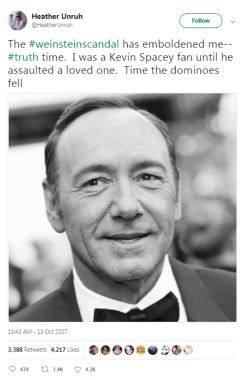 Η Χίδερ Ούνρου από το Μιζούρι, παρουσιάστρια του τηλεοπτικού σταθμού WCVB-TV της Βοστόνη και βραβευμένη με Emmy για ιατρικό ρεπορτάζ της, εμφανώς επηρεασμένη από την υπόθεση του Χάρβεϊ Γουάινστιν, αποφάσισε να καταγγείλει δημόσια περιστατικό σεξουαλικής επίθεσης σε βάρος δικού της ανθρώπου από τον Κέβιν Σπέισι, μέσα από τον λογαριασμό της στο twitter.