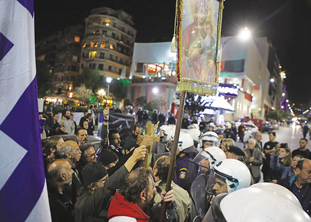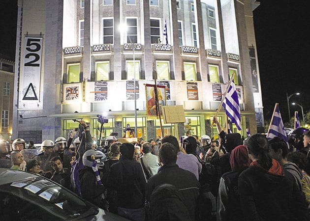 ❱❱ Διαδηλωτές με σημαίες και εικόνες αγίων έξω από το θέατρο Αριστοτέλειον προσπάθησαν να διακόψουν την παράσταση Επεισόδια, με συμπλοκή Αστυνομίας και διαδηλωτών, στη θεατρική πρεμιέρα του Γιώργου Χρανιώτη και της Ευγενίας Σαμαρά στη Θεσσαλονίκη! Ολα άρχισαν όταν περίπου 50 άτομα, που στην πλειονότητά τους δήλωσαν ότι είναι μέλη της οργάνωσης Ιερός Λόχος, συγκεντρώθηκαν το βράδυ της Τετάρτης έξω από το θέατρο Αριστοτέλειον, απέναντι από τον Λευκό Πύργο. Ανάμεσά τους ήταν και ο μοναχός Κλεομένης, για τον οποίο η Ιερά Σύνοδος με ανακοίνωσή της τον περασμένο Ιούλιο ξεκαθάρισε πως «ουδεμία σχέση» έχει με την Εκκλησία της Ελλάδος. Κρατώντας ελληνικές σημαίες και εικόνες αγίων, οι συγκεντρωμένοι άρχισαν να φωνάζουν συνθήματα κατά της παράστασης, με τον τίτλο «Η ώρα του διαβόλου», την οποία είχαν στόχο να διακόψουν. Μάλιστα, κάποια στιγμή επιχείρησαν να προσεγγίσουν το κτίριο, αλλά τους απώθησαν αστυνομικές δυνάμεις, που είχαν παραταχθεί μπροστά από την είσοδο του θεάτρου, και ακολούθησε συμπλοκή.