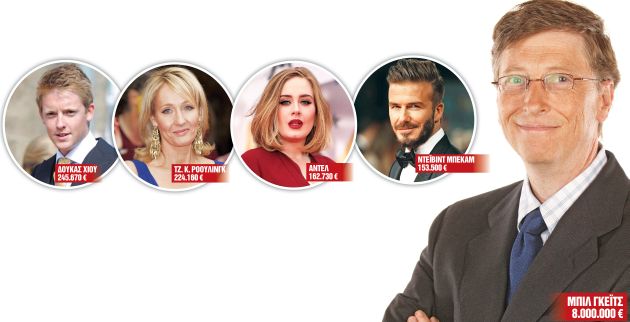 Στην κορυφή της λίστας που δημιούργησε για λογαριασμό της «Daily Mail» η δημοσιογράφος Αλισον Μπόσοφ βρίσκεται ο Μπιλ Γκέιτς, κερδίζοντας την περασμένη χρονιά 8.000.000 ευρώ κάθε ημέρα, ποσό που οι πλειονότητα των εργαζομένων δεν θα έβγαζε ούτε δουλεύοντας μια ολόκληρη ζωή.