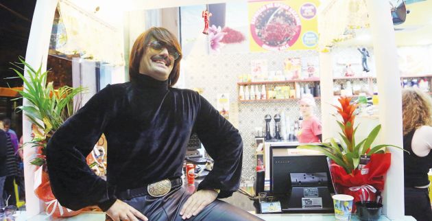Πάντα με στιλιστικές επιλογές από τα 70s, αυτή τη φορά ο ανεξάντλητος Τόνι προτίμησε να ντυθεί στα μαύρα –προφανώς– για να κάνει την αντίθεση με το πολύχρωμο σκηνικό του μαγαζιού του. Μεταξύ των… σπεσιαλιτέ που σερβίρονται στο καφέ του είναι ο εσπρέσο με κρόκο Κοζάνης, όπως αναγράφεται και σε σχετική ταμπέλα, ενώ σε κεντρικό σημείο του μαγαζιού δεσπόζει το κάδρο με τη φωτογραφία του όπου χαμογελά.