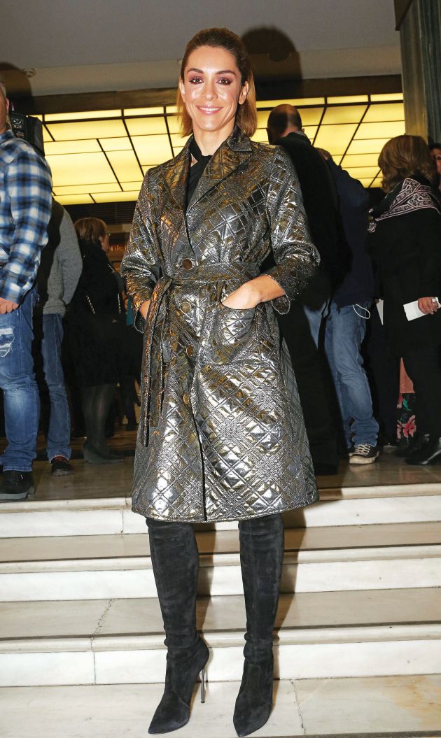 ❱❱ Η Γιούλικα Σκαφιδά με το -συλλεκτικής αξίας- παλτό του RoboCop! Και επειδή ένα τέτοιο κομμάτι δύσκολα σετάρεται (ίσως μόνο με αλουμινόχαρτο), η ηθοποιός επέλεξε μαύρες μπότες και φόρεμα, ενώ ενίσχυσε τη λάμψη της με ιριδίζον μακιγιάζ!
