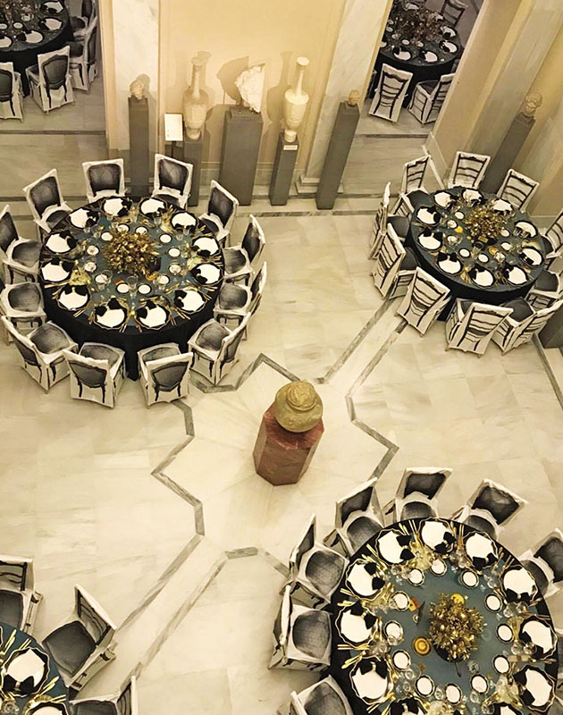 Το δείπνο-υπερπαραγωγή παρατέθηκε στο ισόγειο του Μουσείου Μπενάκη, δίπλα στις προθήκες με τα αγάλματα. Στήθηκαν ροτόντες των 12 ατόμων με εντυπωσιακό στολισμό και κυρίαρχα χρώματα το μαύρο και το χρυσό. Το μενού της βραδιάς επιμελήθηκε ο σεφ Δημήτρης Σκαρμούτσος. Το πρώτο πιάτο περιλάμβανε σολομό με αβγοτάραχο και για κυρίως σερβιρίστηκε φιλέτο με κάστανα! Ωστόσο δεν έμειναν όλοι για φαγητό. Ο Ηλίας Ψινάκης, για παράδειγμα, αποχώρησε άρον άρον λόγω επαγγελματικών υποχρεώσεων. Στην έξοδο όλοι οι παρευρισκόμενοι πήραν δώρο από μια φουντίτσα και αρώματα με την υπογραφή του Ζαν Πολ Γκοτιέ.
