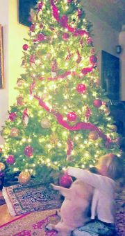 Η μικρή φωτογραφήθηκε αγκαλιά με το χαριτωμένο σκυλάκι της οικογένειας, ράτσας Παγκ, μπροστά στη φάτνη, παρατηρώντας -προφανώς εντυπωσιασμένη- τις δεκάδες χρυσές και κόκκινες μπάλες, την κόκκινη κορδέλα και τα χρωματιστά λαμπιόνια του πανύψηλου δέντρου.