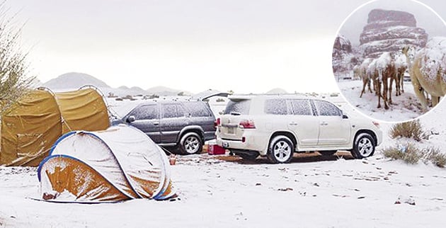 ❱❱ Καμήλες καλυμμένες με χιόνι, παιδιά που παίζουν με έλκηθρα και Σαουδάραβες να κάθονται πάνω σε κατάλευκο «πέπλο» αποτελούν τις πιο χαρακτηριστικές εικόνες…… από την πρωτοφανούς έντασης χιονόπτωση που έπληξε την έρημο της Σαουδικής Αραβίας κοντά στην πόλη Ταμπούκ. Οι Σαουδάραβες έσπευσαν να εκμεταλλευτούν την ευκαιρία που τους προσέφερε το σπάνιο φαινόμενο για να διασκεδάσουν και να απαθανατίσουν στον φωτογραφικό φακό τις μοναδικές στιγμές που ζούσαν. Παρόμοια καιρικά φαινόμενα παρατηρήθηκαν τόσο στο Ιράν όσο και στη Συρία τις τελευταίες ημέρες.