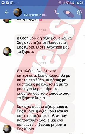 «Δεν έχω καμία αξία μπροστά σας, παρά μόνο για να σκουπίζω τις σόλες των παπουτσιών σας, είμαι ένα μηδενικό, ένας αρσενικός σκλάβος που πιστεύει στη θηλυκή υπεροχή και υποστηρίζει την παγκόσμια μητριαρχία» συνέχισε ο Σπύρος, εκλιπαρώντας τη Στέλλα να γίνει η αφέντρα του και να τον υποτάξει δίνοντάς του ένα γερό ξύλο με μαστίγιο!