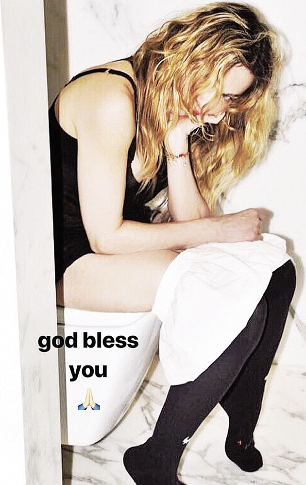 ❱❱ Καθισμένη στον «θρόνο» της, η βασίλισσα της ποπ πόζαρε, δίνοντας παράλληλα τις… ευλογίες της στους followers της.Η 59χρονη Μαντόνα προκάλεσε ακόμη μια φορά αναρτώντας στο Instagram φωτογραφία της από την τουαλέτα του σπιτιού της με κατεβασμένο το λευκό σορτσάκι της, κοιτάζοντας βαριεστημένα προς την κάμερα και γράφοντας «ο θεός να σας ευλογεί» στη λεζάντα που τη συνόδευε.
