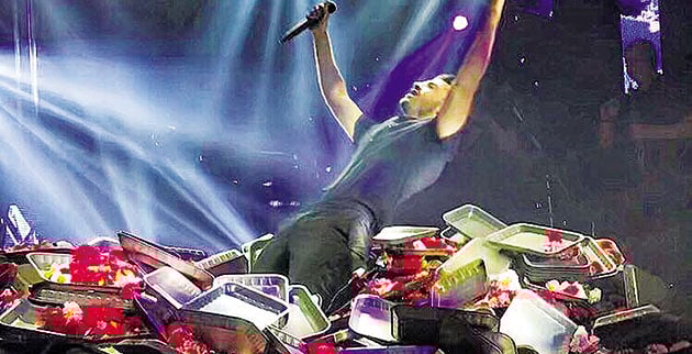 antΟπως φαίνεται και στις φωτογραφίες που έκαναν τον γύρο των social media, οι θαυμαστές του καλλιτέχνη του πέταξαν τόσα πολλά λουλούδια στην πίστα, που από ένα σημείο και μετά για να τραγουδήσει χρειάστηκε να κάνει… ορειβασία πάνω στα πανέρια και τα γαρίφαλα!