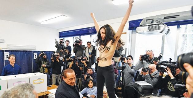 ❱❱ Με τη μάταιη προσδοκία ότι η γύμνια της θα σοκάρει τον Σίλβιο Μπερλουσκόνι, γυμνόστηθη του κινήματος Femen πετάχτηκε μπροστά του την ώρα που ψήφιζε σε εκλογικό τμήμα του Μιλάνου. Η μελαχρινή κοπέλα είχε γράψει με μαρκαδόρο πάνω στο δέρμα της το σύνθημα «Μπερλουσκόνι είσαι ληγμένος», κάτι που δεν ισχύει, καθώς ο αρχηγός της Φόρτσα Ιτάλια μπορεί να επανακάμψει στο πολιτικό προσκήνιο μέσω ενός κεντροδεξιού συνασπισμού. Ο 81χρονος Καβαλιέρε απλώς φρόντισε να απομακρυνθεί και άφησε τους αστυνομικούς να αναλάβουν τα υπόλοιπα.