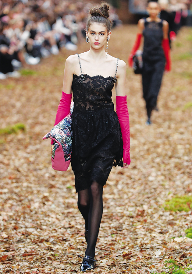 Με δαντέλα εμφανίστηκε και ο «νεοσσός» της πασαρέλας Κάια Γκέρμπερ, η 16χρονη κόρη της Σίντι Κρόφορντ. Ο «Κάιζερ» της μόδας επέλεξε να ανοίξει τη φθινοπωρινή διάθεση με ψηλά δερμάτινα γάντια χωρίς δάκτυλα, σε πολύ έντονα χρώματα.