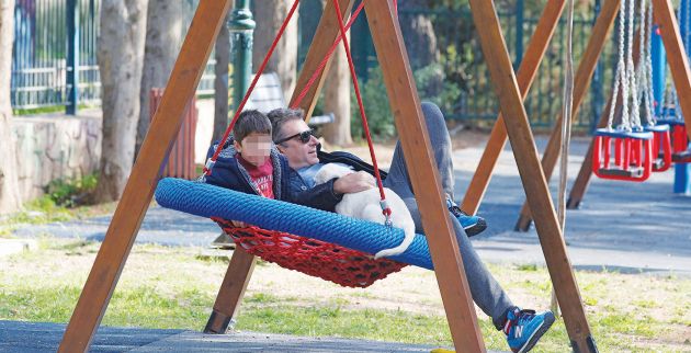 ❱❱ Ο Γιώργος Λιάγκας «χυμένος» πάνω στην κούνια (που… παλαντζάρει προς το μέρος του από το βάρος), με τον δεύτερο γιο του, τον Δημήτρη, να προσπαθεί να χωρέσει κι αυτός και να μη γείρει εντελώς προς τον πατέρα του. Το σκυλάκι στην αγκαλιά τους, ονόματι Οσκαρ, συμπληρώνει την όμορφη οικογενειακή εικόνα. Τα πόδια του Λιάγκα και η ουρά του σκύλου προεξέχουν από την κούνια, η οποία είναι μικρή βέβαια, αλλά φαίνεται να έχει μεγάλη αντοχή!