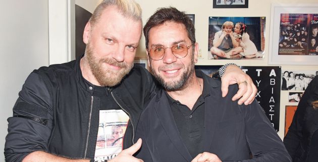 ❱❱ Ο Κώστας Σπυρόπουλος και ο Γιώργος Μαζωνάκης ποζάρουν στον φακό! Ο τραγουδιστής έχει ένα ελαφρώς αμήχανο χαμόγελο στα χείλη και τις παλάμες του κλειστές μπροστά στο στήθος – κίνηση που φανερώνει άμυνα, όπως λένε οι γνώστες της γλώσσας του σώματος!