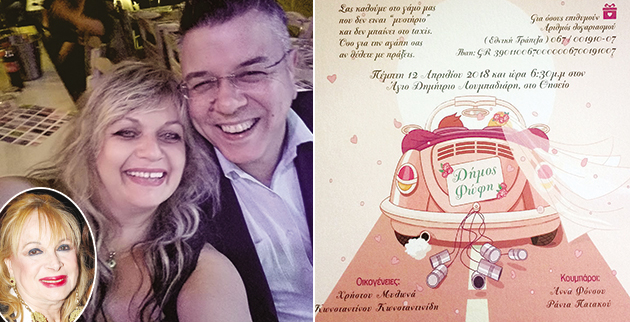 «Σας καλούμε στο γάμο μας που δεν είναι “μυστήριο” και δεν μπαίνει στο taxis! Οσο για την αγάπη σας, αν θέλετε με πράξεις» γράφει το στιχάκι στη ροζ πρόσκληση με φόντο έναν γαμήλια στολισμένο κάμπριο σκαραβαίο. Στο προσκλητήριο, αντί για λίστα γάμου, αναγράφεται ένας τραπεζικός λογαριασμός για όσους από τους καλεσμένους θελήσουν «να δείξουν την αγάπη τους με πράξεις», όπως λέει και το γαμήλιο κειμενάκι!