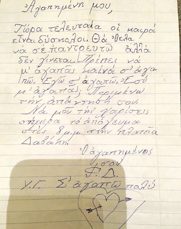 «Σημείωμα που έγραψα στη Λένα από το άλλο τμήμα την άνοιξη του 1983 (Δ´ Δημοτικού). Το βρήκα σήμερα, σε πασχαλινή εξόρμηση στην αποθήκη στο πατρικό. Οι άνθρωποι δεν αλλάζουν» έγραψε στο post του στο facebook δίπλα από το «ντοκουμέντο» του παιδικού του έρωτα ο δημοφιλής τραγουδοποιός, ο οποίος είχε μπει από μικρός στα βάσανα του έρωτα, καταφέρνοντας να ενθουσιάσει τους διαδικτυακούς φίλους του.