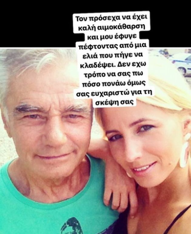 «Συλλυπητήρια, Κατερίνα μου. Θέλω να έχεις δύναμη και κουράγιο για τον πατέρα σου, που “έφυγε” τόσο ξαφνικά». Η παρουσιάστρια, συγκλονισμένη από το θλιβερό γεγονός, δημοσίευσε στα μέσα κοινωνικής δικτύωσης μια φωτογραφία της με τον πατέρα της, αποκαλύπτοντας ότι πάλευε με ένα σοβαρό πρόβλημα υγείας. «Τον πρόσεχα να έχει καλή αιμοκάθαρση και μου έφυγε πέφτοντας από μια ελιά που πήγε να κλαδέψει. Δεν έχω τρόπο να σας πω πόσο πονάω, όμως σας ευχαριστώ για τη σκέψη σας» έγραψε.
