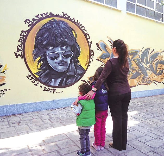 Πήρε τα δύο παιδιά της και πήγαν στη Νέα Φιλαδέλφεια, όπου λίγες μέρες μετά την απώλεια του κορυφαίου πρωταγωνιστή μας ο street artist με το ψευδώνυμο «Πλάτων» δημιούργησε ένα εντυπωσιακό γκράφιτι-φόρο τιμής στον Στάθη Ψάλτη.