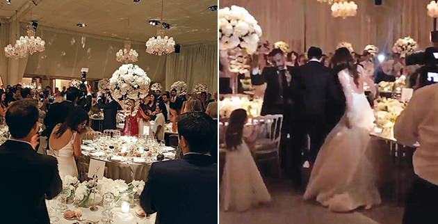 Οι ακριβές σαμπάνιες έκαναν… παρέλαση πάνω στις γαμήλιες ροτόντες, όλες στολισμένες με λευκά λουλούδια και κεριά, ενώ το μενού περιελάμβανε γκουρμέ πιάτα με ψάρι ή κρέας και έναν μεγάλο μπουφέ με γλυκά όλων των ειδών.