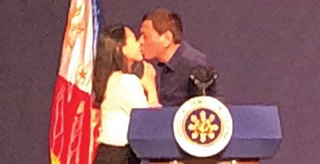 Ο Ροντρίγκο Ντουτέρτε κατά τη διάρκεια ομιλίας του στη Νότιο Κορέα είδε στο πλήθος μια Φιλιππινέζα και της ζήτησε να ανέβει στη σκηνή, όπου τελικά την έπεισε να φιληθούν στο στόμα. Η κίνηση αυτή προκάλεσε τον ενθουσιασμό του κοινού, το οποίο απαρτιζόταν κατά κύριο λόγο από Φιλιππινέζους που εργάζονται στη Νότια Κορέα, ωστόσο η οργάνωση υπέρ των γυναικείων δικαιωμάτων Gabriela τη χαρακτήρισε «σιχαμένους θεατρινισμούς από έναν μισογύνη πρόεδρο».