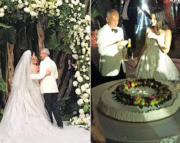 Το haute couture νυφικό της ήταν δημιουργία του διάσημου Λιβανέζου designer Elie Saab, κεντημένο όλο στο χέρι και με εντυπωσιακή ουρά πέντε μέτρων, ενώ το μοναδικό κόσμημα που φορούσε ήταν το πολλών καρατίων μονόπετρο που της είχε χαρίσει ο σύζυγός της, με ασορτί διαμαντένια σκουλαρίκια.