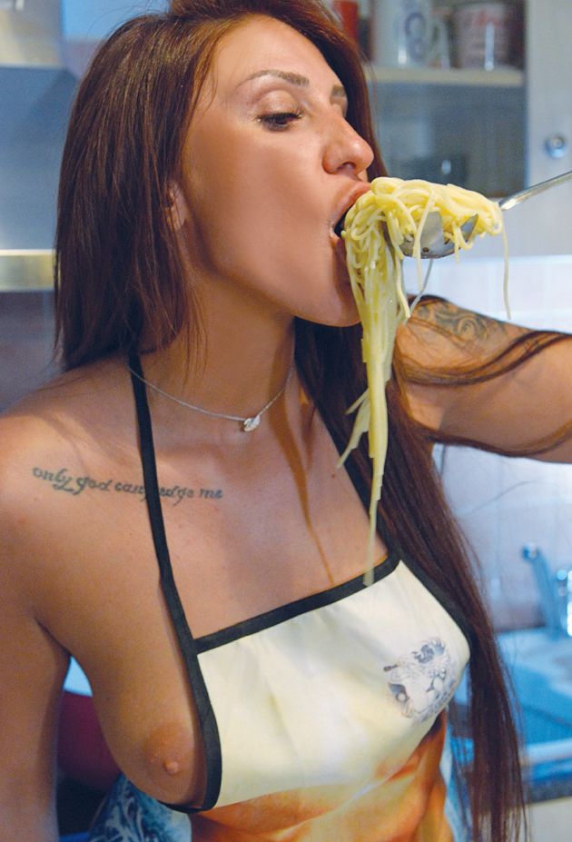 Η εντυπωσιακή μελαχρινή με το γυμνασμένο σώμα, τα ατέλειωτα πόδια και το κουνελάκι του «Playboy» στον σμιλεμένο γλουτό της δείχνει να τα καταφέρνει καλά στο μαγείρεμα και έχει μια έκφραση ικανοποίησης όταν δοκιμάζει τη λαχταριστή -όχι, βέβαια, όσο η ίδια!- μακαρονάδα που μόλις έφτιαξε.