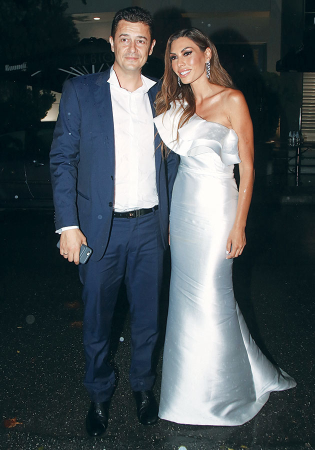 Το νιόγαμπρο ζευγάρι κατέφτασε στο μαγαζί -στολισμένο με λευκά άνθη για την περίσταση- νωρίτερα από όλους. Πιασμένοι χέρι χέρι και χαμογελαστοί, υποδέχονταν μέχρι αργά τους προσκεκλημένους, μεταξύ των οποίων ήταν ο πρόεδρος του Ομίλου Alpha Δημήτρης Κοντομηνάς συνοδευόμενος από την αγαπημένη του Λόρι Χόλκομπ, η οποία επέλεξε για την περίσταση ένα αέρινο ροζ σύνολο, η Αγγελική Νικολούλη με λευκό παντελόνι, μαύρη πουκαμίσα και ίδιο χρώμα ομπρέλα λόγω της βροχής, η Ελεονώρα Μελέτη με τον σύζυγό της Θοδωρή Μαροσούλη, η Βίκυ Χατζηβασιλείου με μεταξωτά, ο Γιώργος Μαζωνάκης, καθώς επίσης η Σταματίνα Τσιμτσιλή με σέξι μίνι, συνοδευόμενη από τον σύζυγό της Θέμη Σοφό.