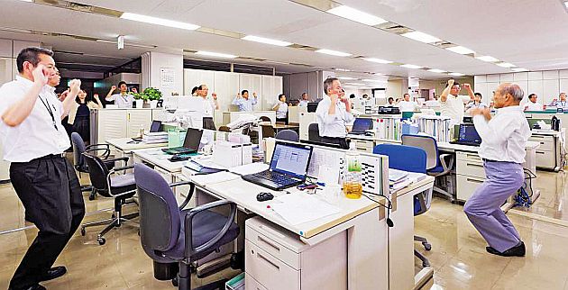 ❱❱ Κάθε ημέρα, περίπου 28.000.000 Ιάπωνες σταματούν την εργασία τους στα γραφεία εταιριών για να γυμναστούν με τους συναδέλφους τους, υπό τους ήχους χαλαρωτικής μουσικής από το ραδιόφωνο Τι κι αν φορούν γραβάτες και πουκάμισα; Κάνουν όλοι μαζί διατάσεις, επικύψεις και «καθίσματα» για να είναι σε φόρμα.