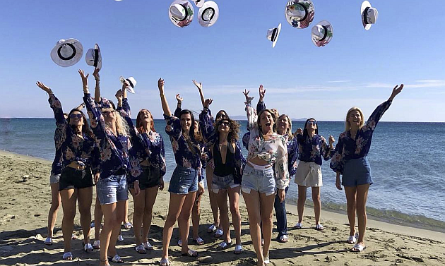 Το ραντεβού δόθηκε στην Τήνο και όλες οι συμμετέχουσες φίλες της, ανάμεσά τους η Βάσω Λασκαράκη και η Χριστίνα Κοντοβά, εμφανίστηκαν φορώντας τα ίδια ρούχα: τζιν σορτς, φλοράλ πουκάμισα και υπέροχα ζωγραφισμένα καπέλα.