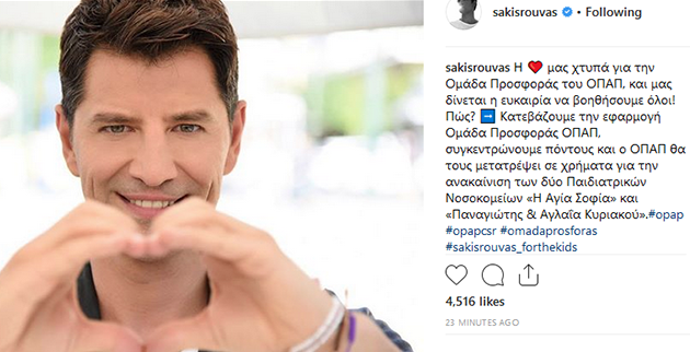 H καρδιά του Σάκη Ρουβά χτυπά για την «Ομάδα Προσφοράς ΟΠΑΠ»!  Ο δημοφιλής τραγουδιστής, ο οποίος είναι ευαισθητοποιημένος απέναντι στα παιδιά, έχει αγκαλιάσει την πρωτοβουλία του ΟΠΑΠ για την ανακαίνιση των δύο παιδιατρικών νοσοκομείων, έχει κατεβάσει την εφαρμογή, έχει δημιουργήσει τη δική του ομάδα και ζητεί από τους followers του στα social media να τον ακολουθήσουν και στην «Ομάδα Προσφοράς».