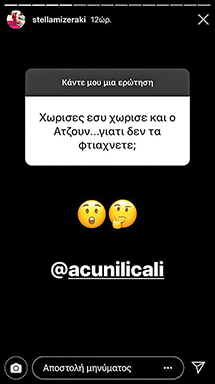 Το σχόλιο μιας follower που έγραψε «Χώρισες εσύ, χώρισε και ο Ατζούν… γιατί δεν τα φτιάχνετε;» δεν φάνηκε να σοκάρει τη νικήτρια του «Power of love». Ισα ίσα που απέφυγε να απαντήσει, κι αφού ανάρτησε δύο φατσούλες -έκπληξης και προβληματισμού- πρόσθεσε στο post τον λογαριασμό του «Mr Survivor»!