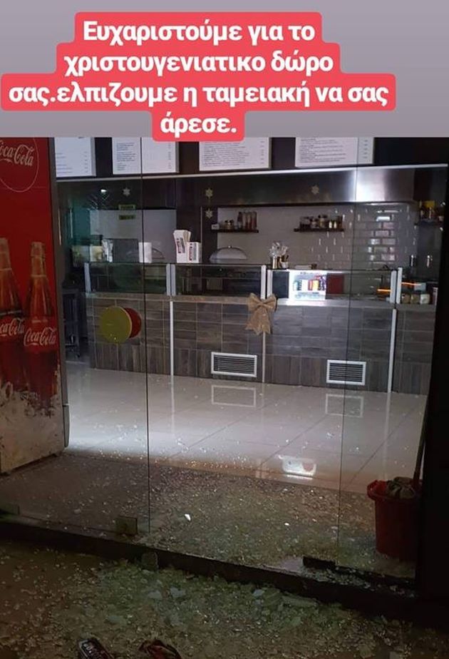 Φτάνοντας στο cafe της οδού 25ης Μαρτίου, στο οποίο μπήκε ως συνεταίρος πριν από λίγες ημέρες, είδε την τζαμαρία σπασμένη και την ταμειακή μηχανή να έχει κάνει «φτερά». Ο ίδιος έκανε γνωστό το γεγονός ανεβάζοντας μια φωτογραφία από το μαγαζί, δείχνοντας τα… γυαλιά καρφιά. «Ευχαριστούμε για το χριστουγεννιάτικο δώρο σας. Ελπίζουμε η ταμειακή μηχανή να σας άρεσε» σχολίασε με ειρωνεία.