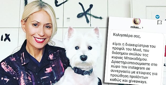 ❱❱ Επιτήδεια έφτιαξε λογαριασμό στο Ιnstagram με το όνομα του σκύλου της Μπακοδήμου για να βγάλει χρήματαΘύμα διαδικτυακής απάτης η Μαρία Μπακοδήμου, αλλά και ο Μικές, ο χαριτωμένος σκύλος της!