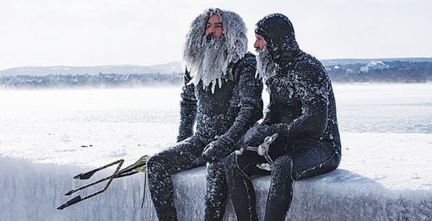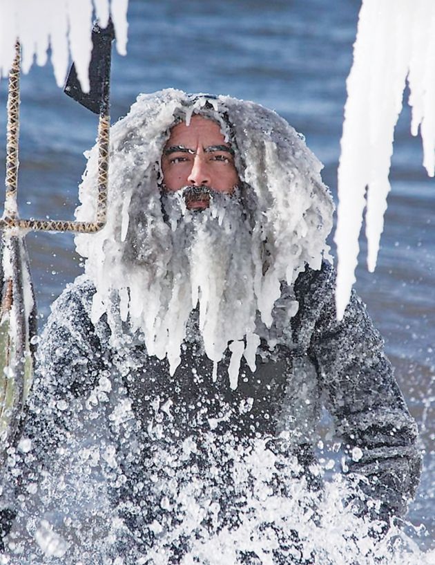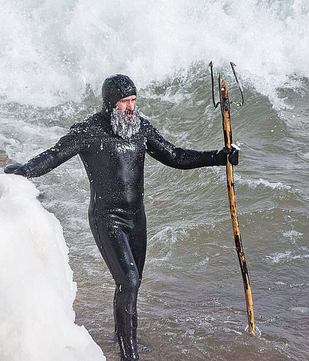 ❱❱ Κρατώντας τρίαινα ο σέρφερ Ντάνιελ Σέτερ βγαίνει από τα παγωμένα νερά της λίμνης Σουπίριορ του Μίσιγκαν……στις ΗΠΑ, σαν να ήταν ο Ποσειδώνας, ο θεός της θάλασσας της αρχαιοελληνικής μυθολογίας.