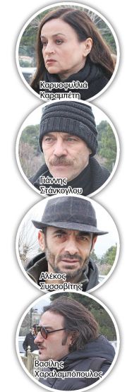 Η Καρυοφυλλιά Καραμπέτη, ντυμένη στα μαύρα, αμακιγιάριστη και σχεδόν αμίλητη, ο Βασίλης Χαραλαμπόπουλος, ο Χρήστος Χατζηπαναγιώτης και ο Κώστας Φαλελάκης κατέφτασαν από νωρίς στον Ιερό Ναό του Αγίου Σεραφείμ στην Πεντέλη, όπου τελέσθηκε η εξόδιος ακολουθία.