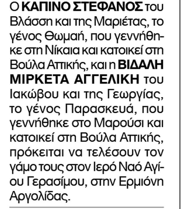 Ο ποδοσφαιριστής Στέφανος Καπίνο και η αγαπημένη του σχεδιάστρια μόδας Μιρκέτα Βιδάλη δημοσίευσαν την αναγγελία γάμου τους στην εφημερίδα «δημοκρατία», γνωστοποιώντας πως το μυστήριο δεν θα τελεστεί ούτε στη Νίκαια ούτε στο Μαρούσι, όπου γεννήθηκαν, αντίστοιχα, αλλά στην Ερμιόνη Αργολίδας!